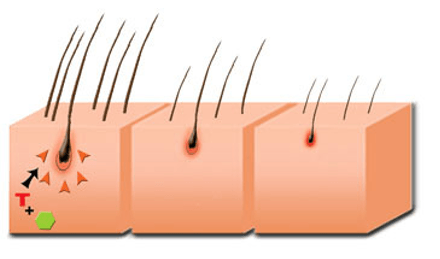 La calvitie a un grand responsable causant la miniaturisation des follicules pileux; la dihydrotestostérone, communément appelée la DHT. En cas d’alopécie androgénique, les récepteurs des follicules pileux sont sensibles à cette hormone. Les cheveux deviennent de plus en plus fins à travers les années, causant le dégarnissement du dessus de la tête.